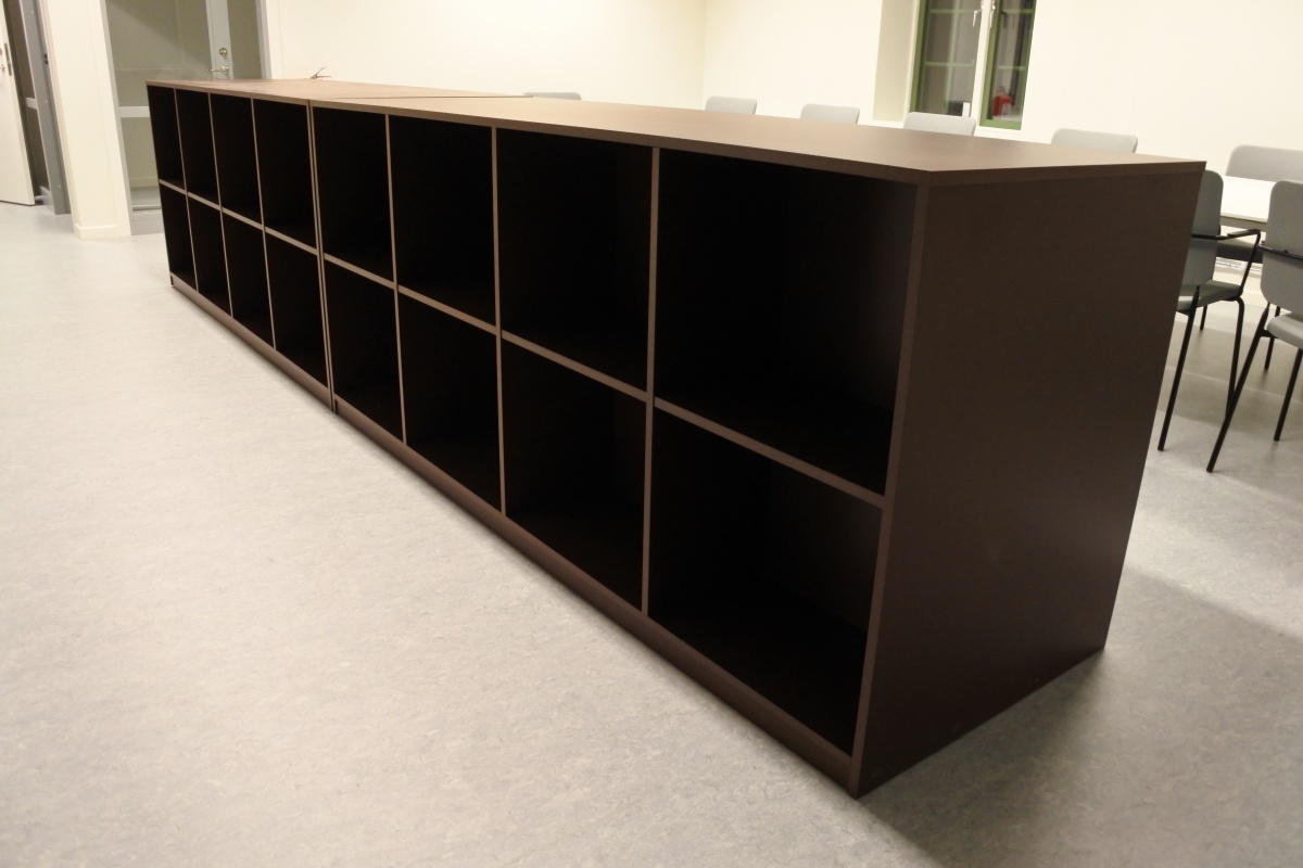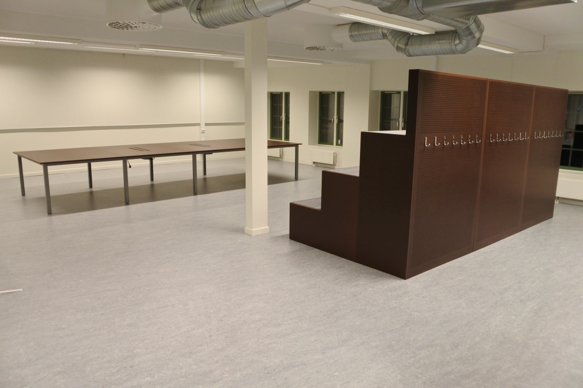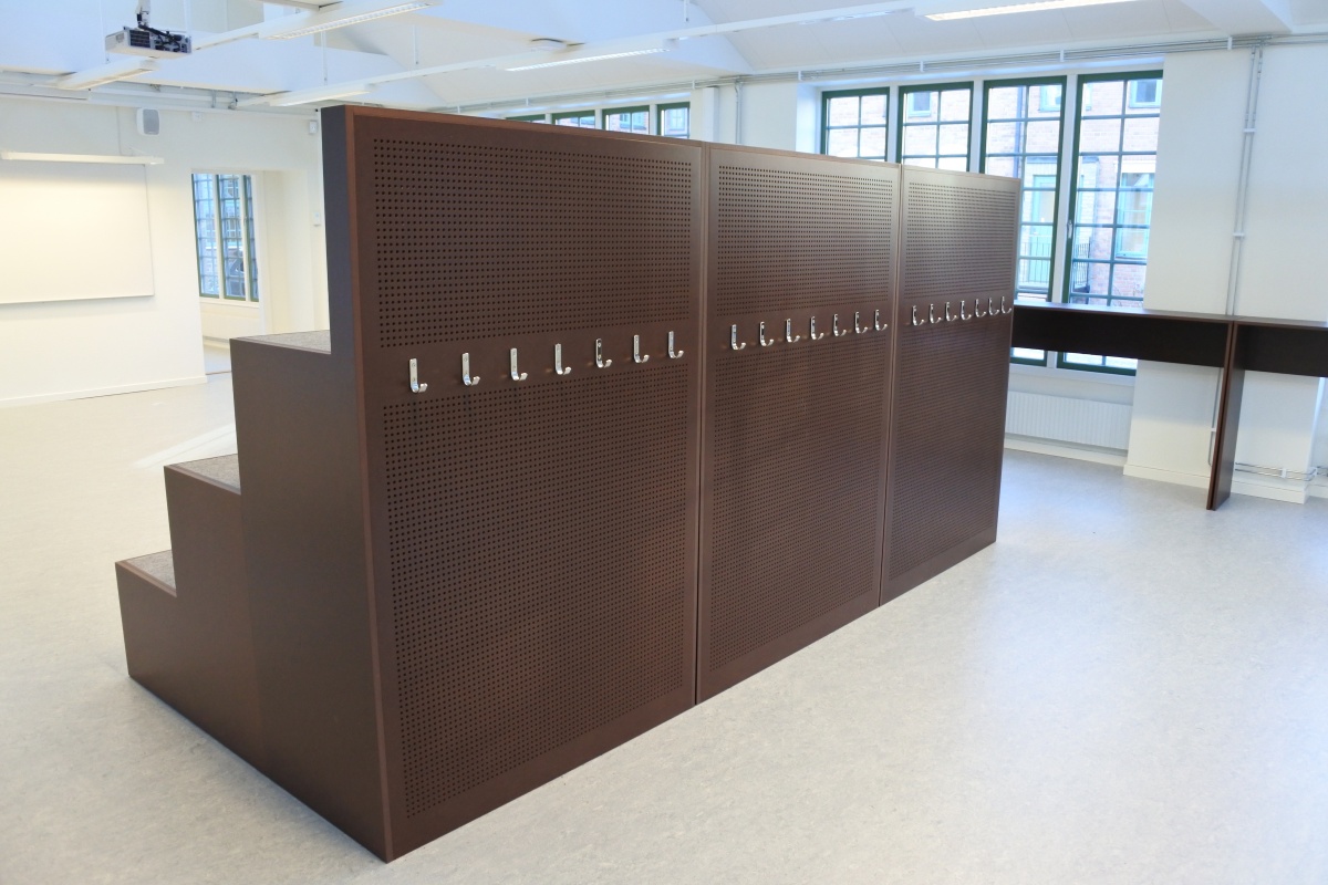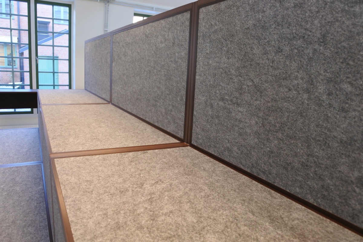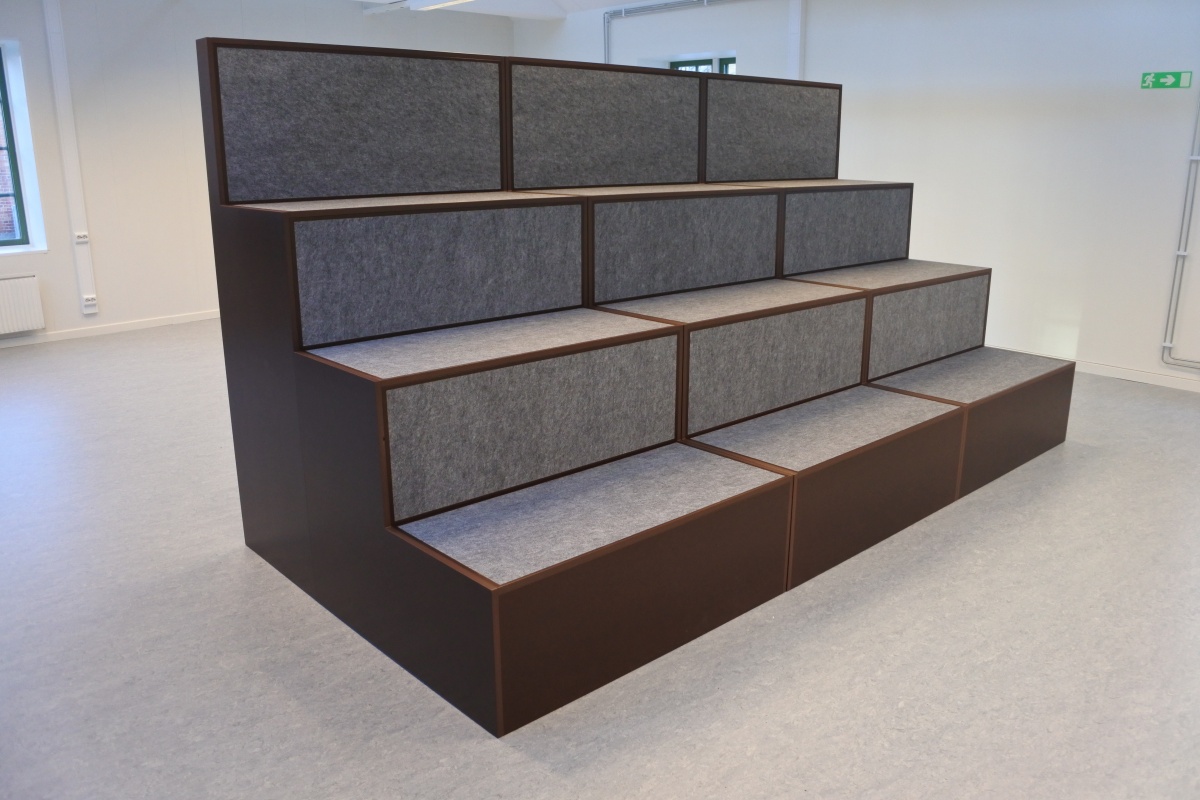 Katedralskolan i Linköping valde möbler ur Sjöstan-serien. Specialdesignade av ansvarig arkitekt hos Arkitema Architects. Chokladbrun genomfärgad MDF i kombination med grå filt gör läktarmöbeln tålig och snygg. Skolan fick också stora bord för samarbete, bord i ståhöjd, bokhyllor och sittbänkar för kapprum etc.