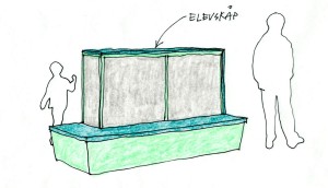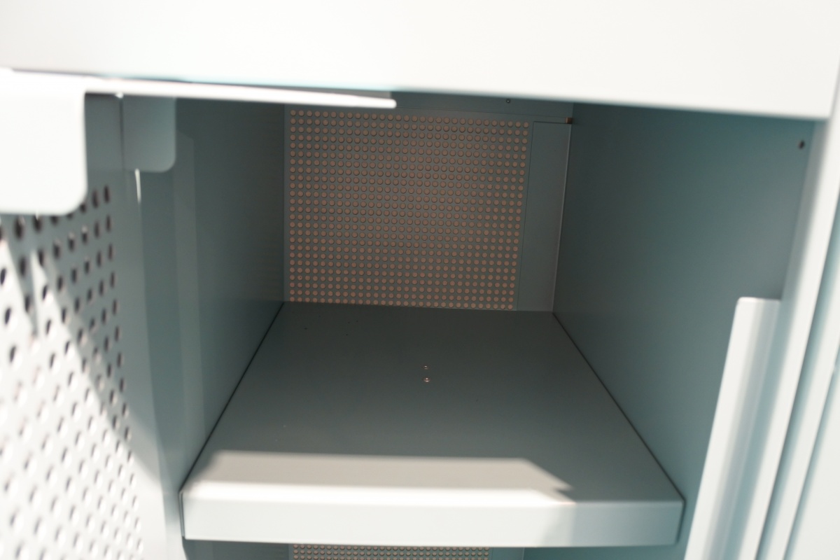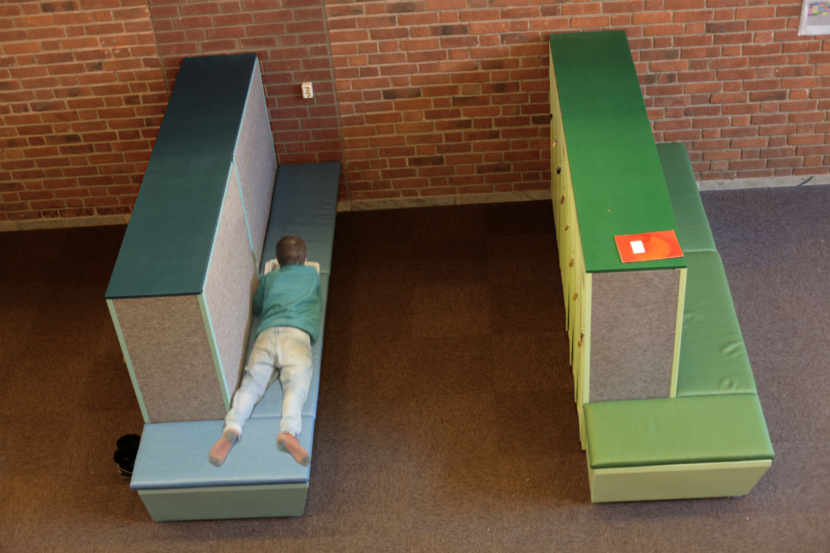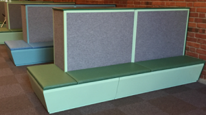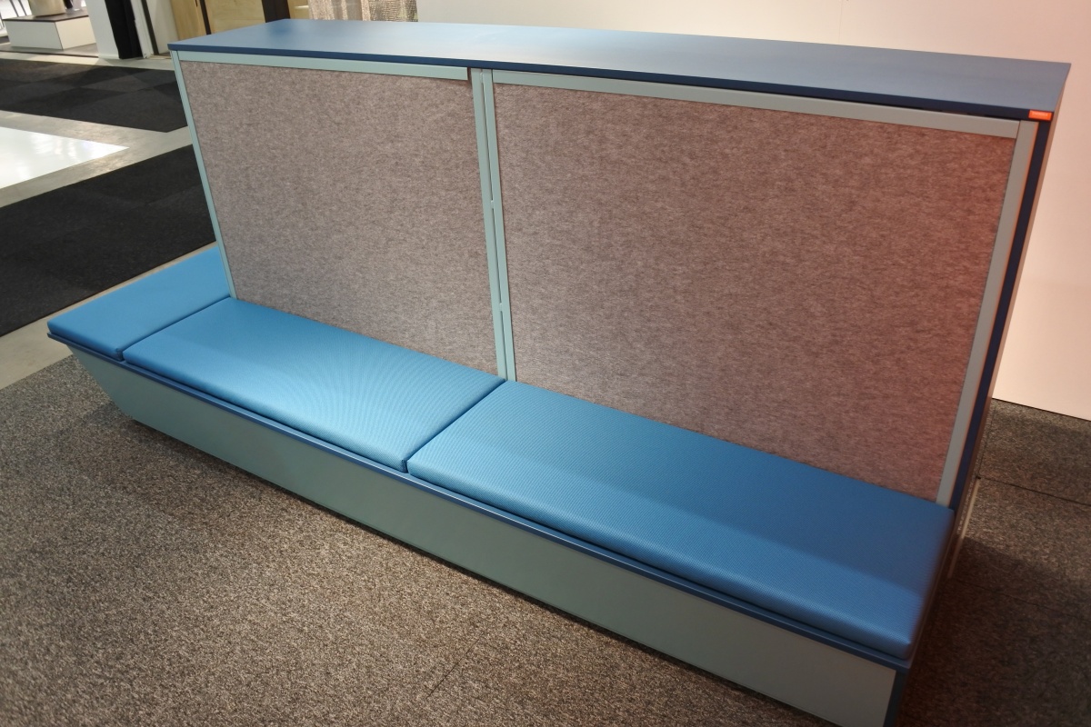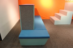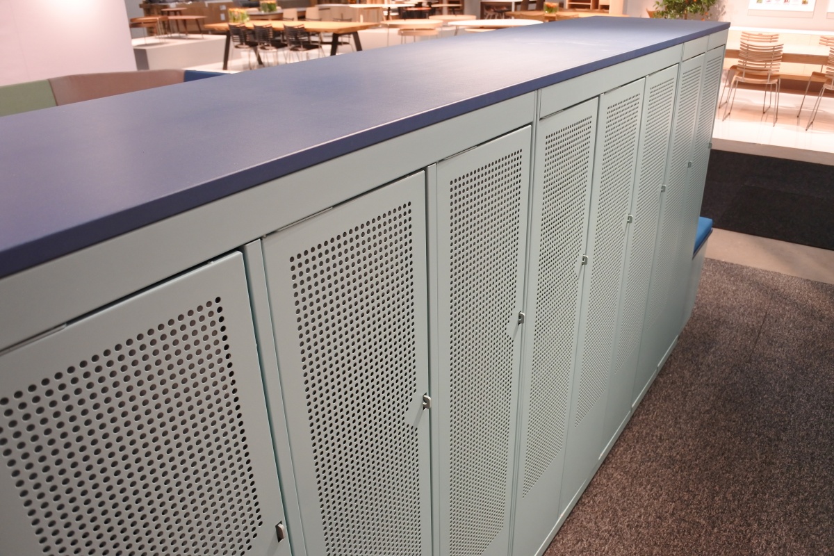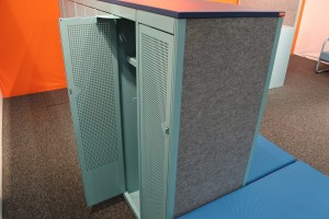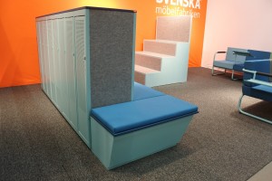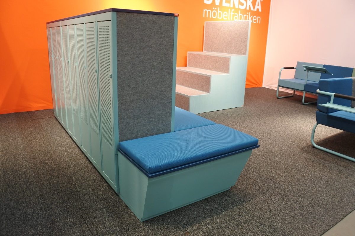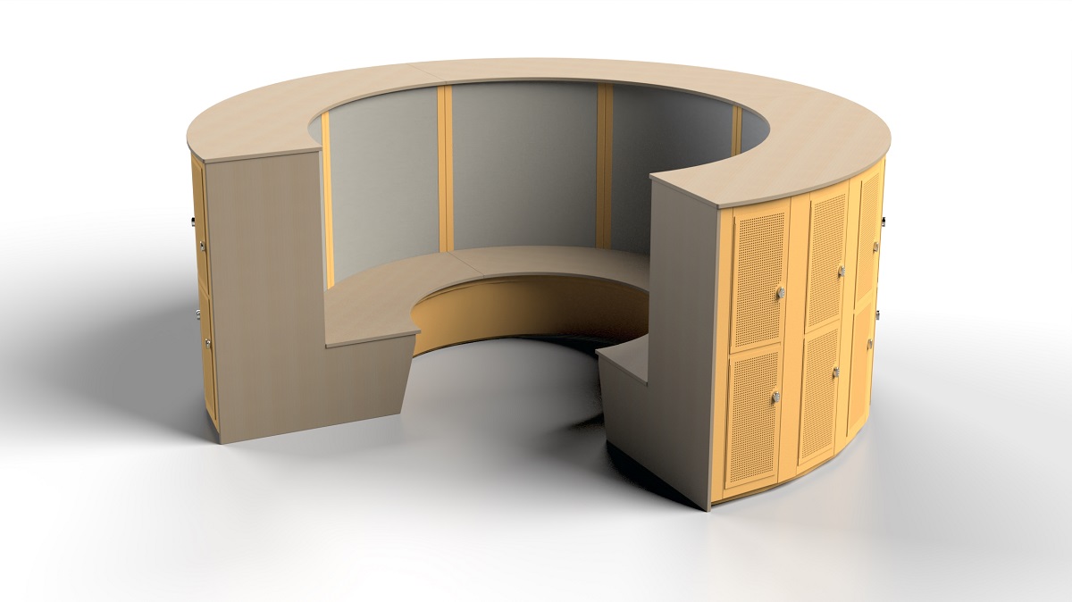 Möbeln består av elevskåp med en fast sittbänk på två sidor. Den unika konstruktionen reducerar oönskat ljud och buller.